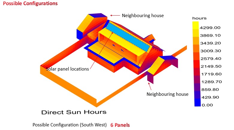 Solar irradiation modeling confirms optimal panel placement despite minor shading from neighboring structures.